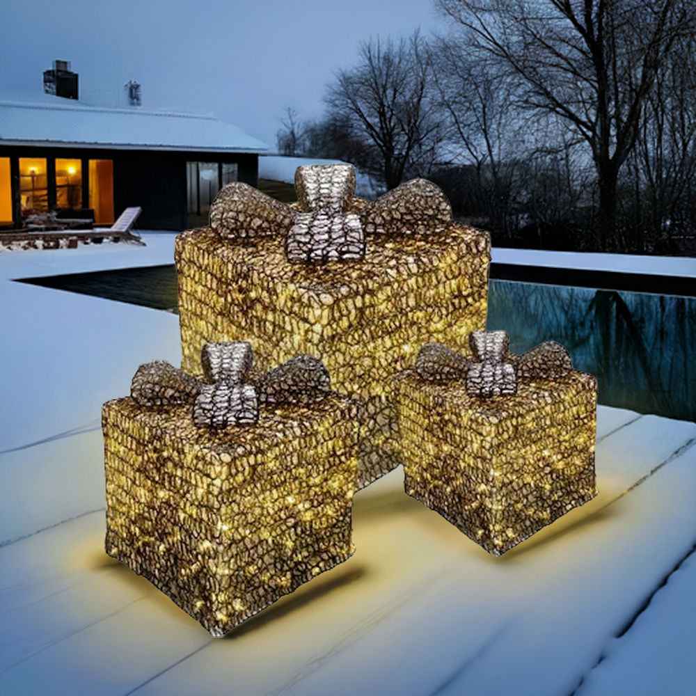 3 leuchtende Geschenkboxen als weihnachtliche Dekoration im Außenbereich. Die 3 LED-Geschenke aus der Schmuck-Motivserie von FDL bestehen aus einem Rahmen aus Metall und einer Oberfläche aus karamell-farbenem Acryl mit Kristall-Optik. Dieser Kristall-Look entsteht durch zahlreiche leicht transparente Acrylfasern, die wie aneinandergereihte Kettenglieder wirken. Vollendet wird der Look durch einen Anteil von warmweissen Flash-LED, deren funkelnde kleine Lichtblitze den einzigartigen Glitzer-Effekt erzeugen. Das 3er-Set LED-Weihnachtsgeschenke beinhaltet je eine Box mit 40 cm (50 LED, 10 Glitzer-LED), 50 cm (100 LED, 15 Glitzer-LED) und 60 cm (200 LED, 25 Glitzer-LED). Zusammen bilden diese ein strahlendes Trio. |