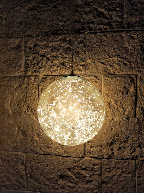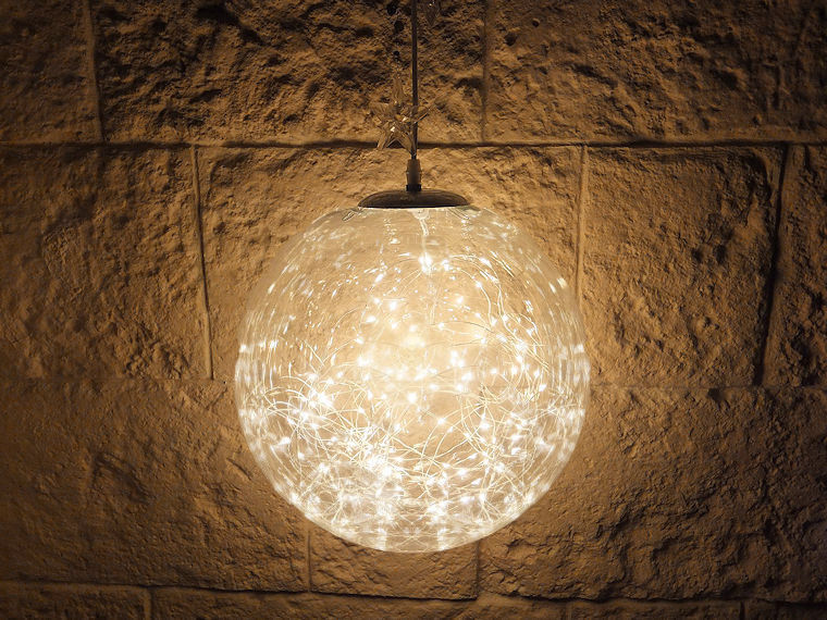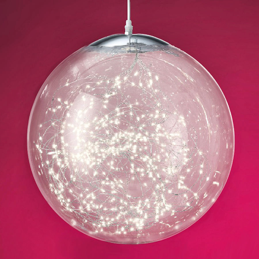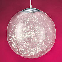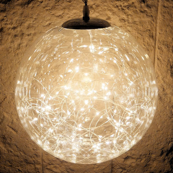 Wunderschöne LED-Schmuckkugel für ein modernes und edles Ambiente in Innen- und sogar Außenbereichen. Die LED-Kugel mit einem tollen Durchmesser von 40 cm besteht aus robustem, klarem Kunststoff. Am oberen Teil der Kugel befindet sich eine von innen eingespannte und nach außen überlappende, verchromte Metallabdeckung. Nach außen schließt sich eine robuste und abdichtende Stellschraube mit einem 5 m langen weißen Zuleitungskabel an. Dadurch wird insbesondere die Optik von hellen Wänden und Decken nicht gestört. Nach Innen rankt ein Lichterbündel, dessen feine Silberdraht-Ketten sich wie zufällig in- und umeinandner winden. Diese sind mit insgesamt 300 hellen, warmweißen Micro-LED-Tropfen besetzt. Die LED-Schmuckkugel ist ein fantastisches Highlight. Transparenz, silberne Elemente und warmweiße Lichtpunkte sorgen für eine außergewöhnlich stylische Optik, die nicht nur zur Weihnachtszeit Betrachter in ihren Bann zieht. Die LED-Drahtkugel ist auch ganzjährig ein herrliches Lichtaccessoire. Ob als Fenster-, Fassaden- und Deckenbehang oder locker um Äste gewickelt und von Carports und Geländern hängend, mit der XL-Dekokugel gelingen einzigartige Lichtkreationen. Der Betrieb erfolgt über einen IP44-Außentransformator. |