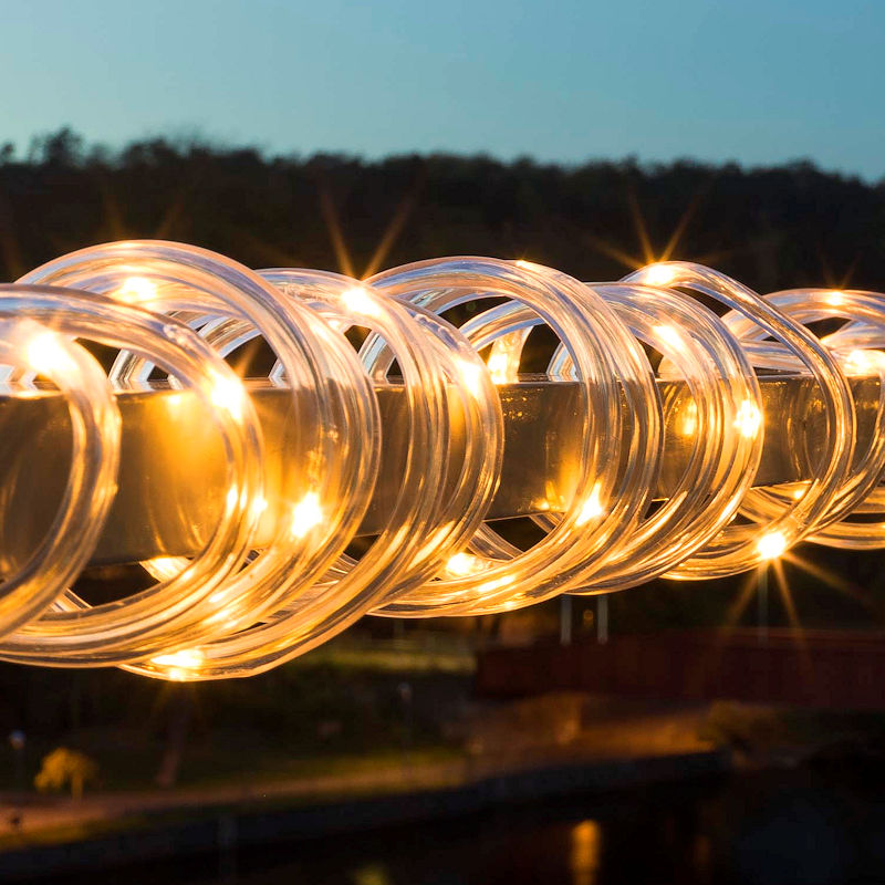 Feiner Mini-Lichterschlauch mit strahlenden bernsteinfarbenen LED für eine zeitlos schöne Konturen- und Dekorationsbeleuchtung in Innenräumen und im Freien. Der LED-Lichtschlauch hat einen schlanken Durchmesser von phänomenalen 0,5 cm und ermöglicht dadurch fantastisch ausgefallene Lichtdekorationen. Auf einer Länge von 20 m sind 260 bernsteinfarbene LED verteilt, die mit klassisch warmweißer Lichtfarbe ein zeitlos schönes Lichtambiente garantieren. Der Mini-Lichtschlauch wird über einen 4,V-Außentrafo betrieben und verfügt über ein praktisches 4 m langes Zuleitungskabel. Aufgrund des geringen Biegeradius können Sie Ihr Dekovorhaben spielend einfach umsetzen. Ob geradlinige Konturen von Kanten und Rahmen oder verspieltes Umwickeln und Umspannen von Pfosten, Geländern und allem, was Sie in Szene setzen möchten, den Mini-Schlauch können Sie ganzjährig für Ihre Ideen einsetzen. Der Mini-Lichtschlauch ist übrigens auch als batteriebetriebene Variante in den Längen 5 m und 10 m erhältlich. |
