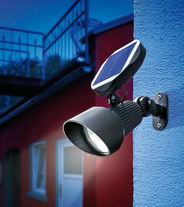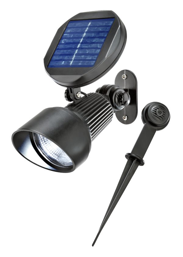 Flexibler Solar Spotlight mit stabilem Aluminiumgehäuse mit Steckspieß für Bodenmontage und Halterung für die Wandmontage. Ideal für die effektvolle Beleuchtung von Sträuchern, Gebüschen, Wasserläufen oder Objekten im Garten geeignet. Das leistungsstarke kippbare Solarmodul sorgt für eine optimale Aufladung der eingebauten Akkus und die weiße Nichia-LED für eine helle Ausleuchtung. Die Solarzellen laden tagsüber den Akku auf. Das Licht schaltet sich bei Dämmerung automatisch ein und bei Helligkeit wieder aus. Außerdem verfügt der Spot zusätzlich über einen Ein-/Ausschalter. Die LED sorgen für nahezu unbegrenzte Lebensdauer und hohe Effektivität. Einfachste Installation ohne Kabel und bis zu 8 Stunden Licht am Stück. | ![]() |