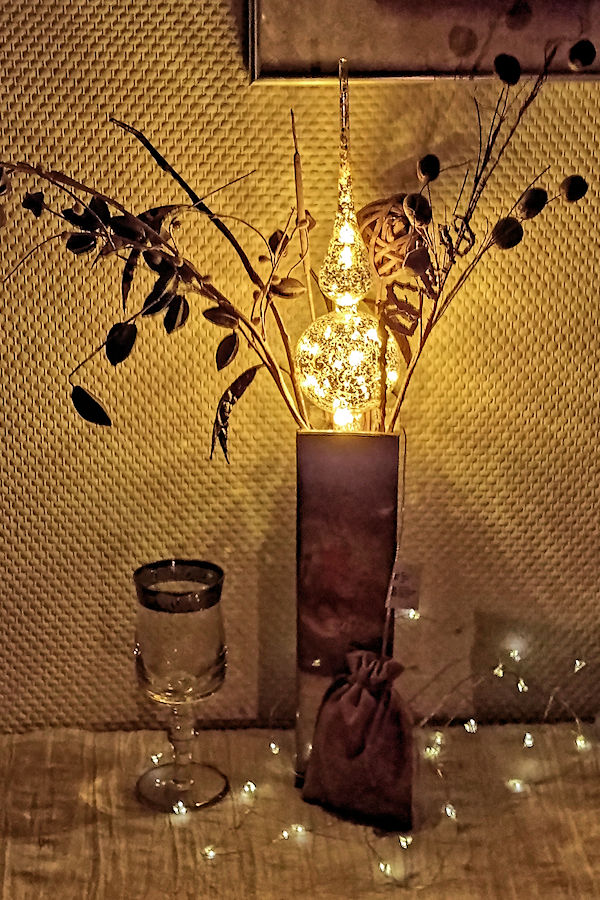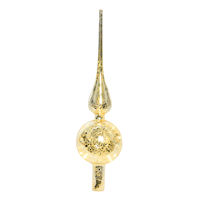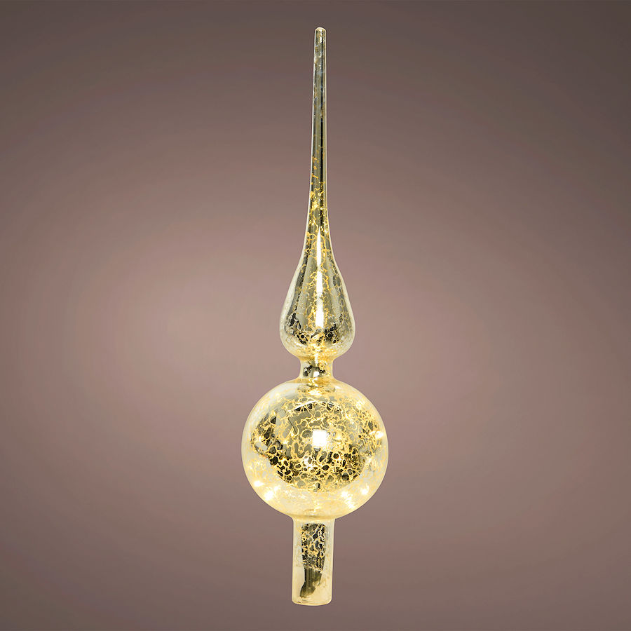 Grazile LED-Christbaumspitze aus Echtglas. Die Baumspitze ist im Inneren mit einer 10-flammigen LED-Lichterkette in warmweiß bestückt und besteht aus Glas mit silbernem Craquele-Dekor. Diese überraschende Kombination erzeugt eine edel stylische Aura und unterstützt die weihnachtliche Stimmung. Die Baumspitze ist 31 cm hoch und hat an der dicksten Stelle einen Durchmesser von 8 cm. Wie eine traditionelle Christbaumspitze wird Sie einfach auf die Spitze des Baums gesteckt. Die Stromzuführung erfolgt durch ein nahezu unsichtbares seitliches Loch. Das Batteriefach hat eine 30 cm lange Zuleitung und wird in einem kleinen Geschenke-Sack aus Jute verstaut. Die Bestückung erfolgt mit 3 Batterien vom Typ Mignon AA. Der praktische Timer schaltet die Glas-Baumspitze bei Inbetriebnahme für 6 Stunden ein und danach für 18 Stunden aus. |