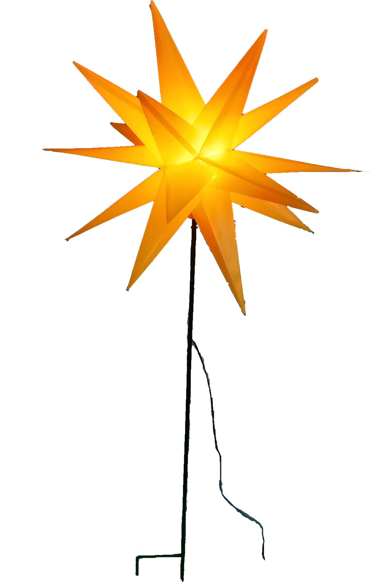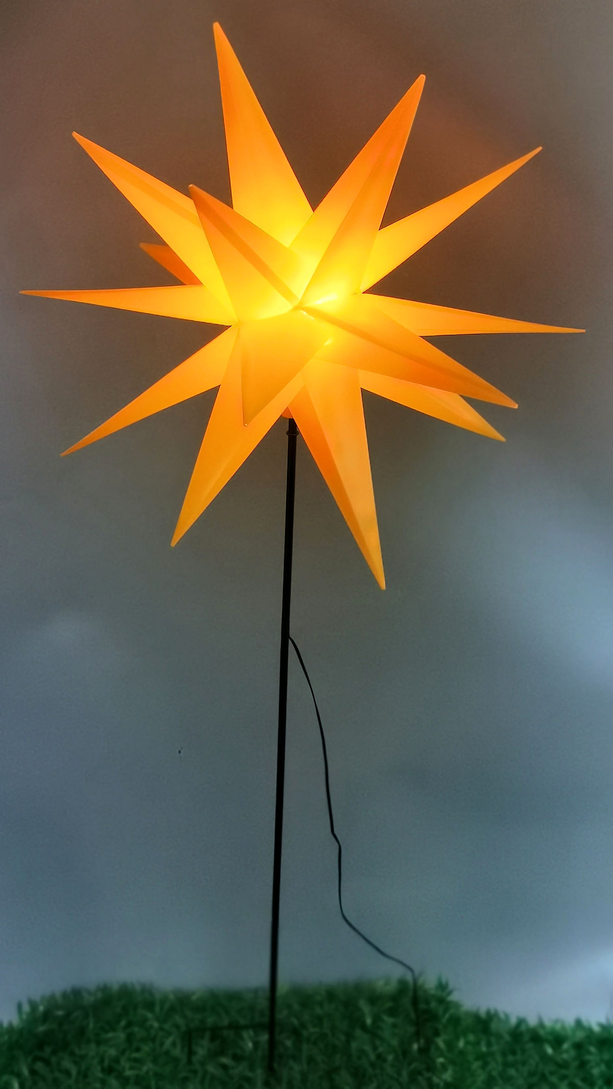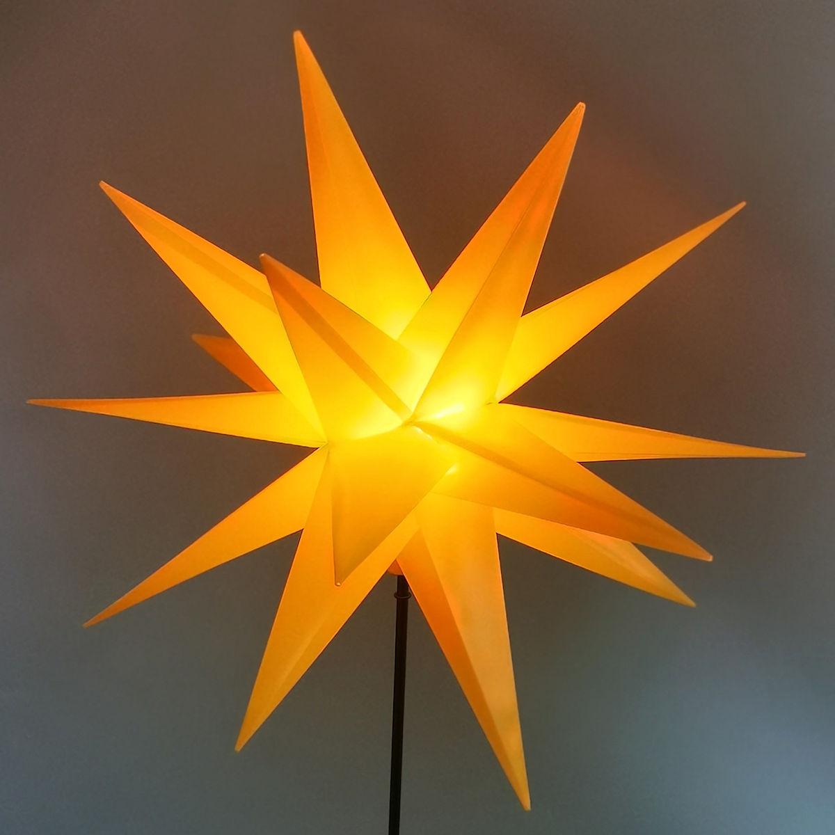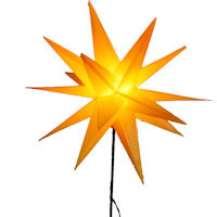 Prächtiger LED-Weihnachtsstern für eine stilsichere und trendbewusste Weihnachtsbeleuchtung im Außenbereich und in Wohn- und Innenräumen. Der gelbe 3D-Stern besteht aus robustem, wetterfestem Kunststoff und hat einen stolzen Durchmesser von 58 cm. Als leuchtender Faltstern wird er zu Inbetriebnahme auseinandergefaltet und kann danach wieder platzsparend aufbewahrt werden. Eine warmweiße LED-Birne mit 6 SMD-LED im Inneren des Sterns lässt ihn kräftig cremeweiß leuchten. Dank des 3D-Designs mit plastischer Formgebung versprüht er seinen Charme von jedem Blickwinkel aus. Der LED-Stern wird mit einem 1,1 m langen, teilbaren Erdstab geliefert. Damit ist der Weihnachtsstern ein Garant für ein modernes Licht-Ambiente. Ein 7,5 m langes Zuleitungskabel gibt genügend Spielraum den Weihnachtsstern dort aufzustellen, wo Sie mögen. Ausgestattet mit einem IP44-Außentranformator verfügt er zusätzlich über einen praktischen 6-Stunden-Timer, der ihn täglich zur Wunschzeit für 6 Stunden einschaltet. Bestaunen Sie die komplette Serie der gelben, roten und weißen 3D-Weihnachtssterne und kombinieren Sie nach Herzenslust. |