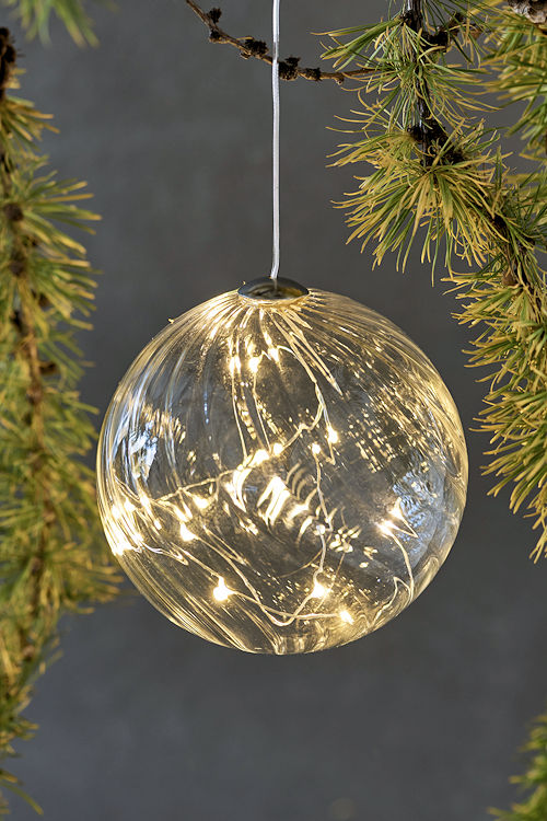 Traumhafte LED-Christbaumkugel mit Batteriebetrieb inkl. Timer für eine erlesene und flexible Weihnachtsdeko in Innenräumen. Die Wave-Serie wurde von der dänischen Künstlerin PERNILLE STRUER für SIRIUS entworfen. Das Wave-Design steht gleichermaßen für Lebhaftigkeit und Sanftheit mit einer modernen, feinsinnigen Note. Die Kugel mit einem Durchmesser von 10 cm ist handgefertigt und besteht aus klarem Echtglas. Das gleichmäßig geschweifte Linienmuster und seine plastische Oberfläche kommen durch die innenliegende, filigrane Lichterkette mit 8 warmweiß strahlenden LED wundervoll zur Geltung. Das warmweiße Licht taucht die Glas-Kugel und ihre reflektierende Umgebung in einen herrlichen Lichterglanz ... wie ruhige Wellen im Meer. Ausgestattet mit einem Batteriefach gelingt im Handumdrehen eine jederzeit veränderbare Beleuchtung. WAVE BALL ist eine erlesene, kabellose Chritbaumkugel, eine Dekokugel zur Fensterbeleuchtung, kann spielend einfach über Zweig-Gestecke in Vasen gehängt werden und schmückt weitere zahlreiche Dekorationen. Das transparente Zuleitungskabel zwischen Kugel und Batteriefach hat eine maximale Länge von 25 cm. Besonders hervorzuheben ist das schicke und innovative Batteriefach in Form eines Chrom-Stabes, der 2 Micro-Batterien versteckt. Das Stab-Batteriefach verfügt über einen kleinen Aufhängungring, es kann jedoch ebenfalls als Gegengewicht dienen. Die integrierte Timerfunktion schaltet die LED-Glaskugel jeden Tag zur gleichen Zeit für 6 Stunden an und danach für 18 Stunden aus. Selbstverständlich können Sie die Kugel auch nach Belieben an- und ausschalten oder die Intervalle ändern. Komfortabel ist, dass die Wave-Serie sogar fernbedienbar ist. Die Fernbedienung ist separat erhältlich. Hier finden Sie die Fernbedienung, die neben der An- und der Aus-Taste über 4 wählbare Timerfunktionen für 2, 4, 6 oder 8 Stunden Leuchtdauer verfügt und für alle fernbedienbaren Sirius-Produkte passt. Unser Tipp: Bei dem passenden Weihnachtskugel-Leuchter-Set WAVE TRIO ist die Fernbedienung im Lieferumfang enthalten. Hier entdecken Sie das Trio-Set. |