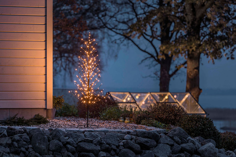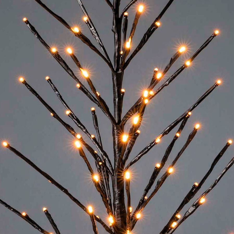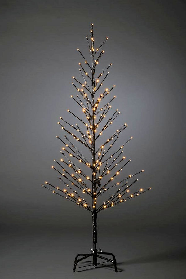 Schwarzer LED-Lichterbaum mit 240 bernsteinfarbenen LED für stylische Licht-Dekorationen mit Glamour-Faktor im Außen- und Innenbereich. Die formvollendete, gleichmäßige Tannenbaumoptik mit schwarzem Stamm und Geäst vereint edle Ästhetik mit glamourösen Style. 240 bernsteinfarbene LED erstrahlen in zeitlos schöner, intensiver, klassisch-warmweißer Lichtfarbe. 120 LED leuchten statisch und 120 LED mit wundervoll zartem Glimmereffekt. Der LED-Lichterbaum ist ein aufregendes Highlight insbesondere in der kalten und dunklen Winter- und Weihnachtszeit. Dabei entfaltet er sowohl in schneearmen als auch in schneereichen Regionen seinen modernen Style. Besonders komfortabel sind die 2 Aufstell- und Befestigungs-Möglichkeiten mit Erdspieß für weiche Untergründe und Standhalterung für harte Böden, die beide im Lieferumfang enthalten sind. Ein immenser Vorteil für einen flexiblen Gebrauch mit immer neuen Dekorations-Ideen. Der LED-Lichterbaum hat eine Höhe von 150 cm, ist komplett anschlussfertig und wird mit einem 24Volt-Außentransformator betrieben. Der LED-Baum für das gewisse Etwas. |