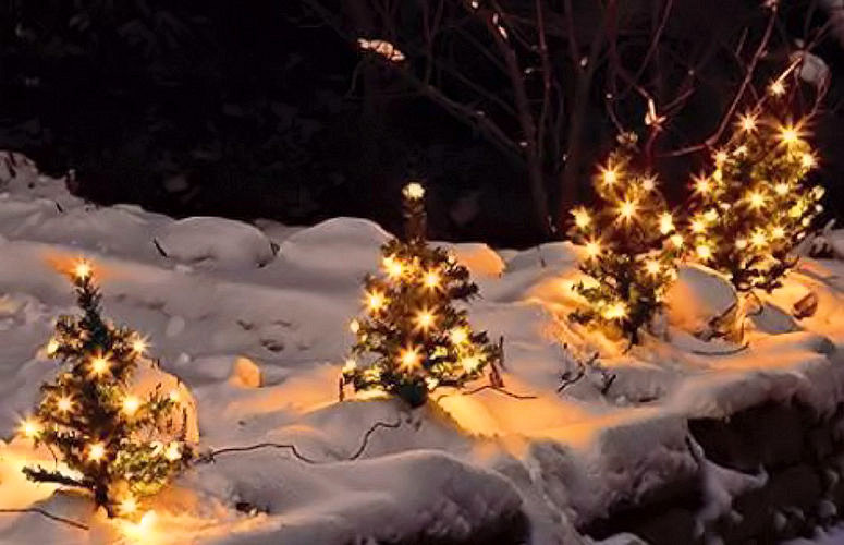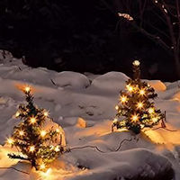 Entzückende LED-Tannenbaumstäbe als 5er-Ensemble für festliche Innen- und Außen-Dekorationen in der Advents- und Weihnachtszeit Die 5 Tannenbaum-Stäbe mit einer Höhe von 25 cm und einer Breite von 13 cm sehen einfach herzig aus. Sie können überall im Freien in weiche Böden gesteckt werden. Aufgrund ihres natürlichen Aussehens fügen sie sich harmonisch in Garten-, Blumen- und Staudenbeete, auf Rasen- Kies- und Sandflächen, aber auch in großen Balkonkästen und Pflanztöpfen harmonisch ein und verleihen Ihrem Ambiente eine liebenswert festliche Note. Die 5 Tannenbaum-Leuchtstäbe sind jeweils mit 12 warmweiß strahlenden LED bestückt und mit einem 70 cm langen Kabel miteinander verbunden. Ob sie die Tannenbäumchen dicht aneinanderreihen oder mit max. 70 cm Abstand dekorieren bleibt ganz Ihnen überlassen. Das Leuchtstäbe-Set wird mit einem IP44-Außentransformator betrieben und verfügt über ein 5 m langes Zuleitungskabel.