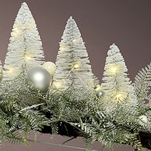 Ästhetisches LED-Bouquet mit wunderschöner Waldszenerie im gefrosteten Snowy-Look, dessen märchenhafte Wirkung und flexible Handhabung bei der Dekoration in Ihrer Wohnung dank des Batteriebetriebes mit Timer überzeugt. Das hochwertige EVERLANDS-LED-Tischbouquet hat einen sagenhafte Größe. Die Länge beträgt 90 cm, die Höhe 26 cm und die Breite 24 cm. ES besteht aus einem schmalen, silberfarbenen Metallgestell, das als minimalistischer Unterbau dient und das Waldmotiv thronend hervorhebt. Der Wintermärchen-Wald besteht aus beschneiten Farn-Ranken und formschönen weißen und silbergraunen Tannen, die als Brush-Trees gefertigt und üppig mit Schnee bedeckt sind. Diese sind auf einem dekorativen, stimmigen Bündel aus braunen Weidenzweigen, die den Waldboden stilisieren angebracht. Der gefrostete Schnee-Look spiegelt sich auch in den glänzenden und seidigmatten Mini-Baumkugeln in Silber- und Weißtönen wieder. Eine feine weiß-transparente Metall-Drahtkette, die kunstvoll die verschiedenen Elemente umwickelt und mit 60 warmweißen LED-Tropfen besetzt ist, rundet die himmlische Optik mit einem warmweißen Lichterglanz ab. Das LED-Bouquet ist mit einem Batteriefach, das mit 3 Micro-Batterien AAA bestückt wird, versehen. Die transparente Zuleitung zum Batteriefach beträgt 30 cm. Der integrierte Timer schaltet den LED-Fensterkanz für 6 Stunden ein und danach für 18 Stunden aus. Ein manuelles An- und Ausschalten ist jederzeit möglich. Das LED-Bouquet ist ein absoluter Eyecatcher winterlicher und weihnachtlicher Tischdekorationen. Es braucht nur noch schönes Geschirr, Gläser und Servietten und Ihre Tischdeko ist fertig. Genießen Sie das geschmackvolle Flair und lassen sich von unserer Wintermärchen-Wald-Serie verzaubern. Hinweis: |