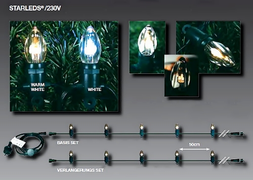 Innovatives, erweiterbares und robustes LED-System mit 230 Volt-Betrieb ohne Trafo für den professionellen Einsatz speziell zur Beleuchtung großer Bäume und weiter Flächen im Außenbereich. Die LED-Lichterkette ist mit 20 Starleds-LED-Kerzen ausgestattet. Jede LED-Kerze ist mit 3 miteinander verlöteten warmweissen LED bestückt. Insgesamt erstrahlen 60 LED mit einem traumhaft schönem warmen Licht. Dabei werden gerade einmal 4,8 Watt verbraucht. Die LED-Kerzen haben ohne Sockel eine stattliche Höhe von ca. 3,5 cm und beeindrucken mit einer einzigartig robusten Qualität, denn die Acrylwände der Kerze weisen seitlich ein Stärke von etwa 7 mm aus. Dadurch entsteht eine facettierte Optik, die für eine traumhafte Lichtverteilung sorgt. Zusätzlich sind die LED-Kerzen dank ihrer E 12-Fassung austauschbar. Der Lampenabstand der LED-Kerzen beträgt 50 cm, so dass diese LED-Lichterkette eine Länge von 10 m misst. Zum Betrieb wird noch das Startkabel benötigt. Mit dem koppelbaren Starleds-LED-System können mit nur einem Startkabel insgesamt bis zu 100 LED-Lichterketten miteinander gekoppelt und eine maximale Länge von 1 km erreicht werden. Das LED-System mit dunkelgrüner Kabelfarbe zeichnet sich durch einen sehr geringen Stromverbrauch aus; 1 LED-Kerze mit 3 LED verbraucht nur 0,24 Watt. Mit dem LED-System von FDL können Sie traumhaft leuchtende Illuminationen verwirklichen und insgesamt 6000 LED über eine Länge von 1 km erstrahlen lassen. FDL ist der Hoflieferant des Belgischen Königshauses.