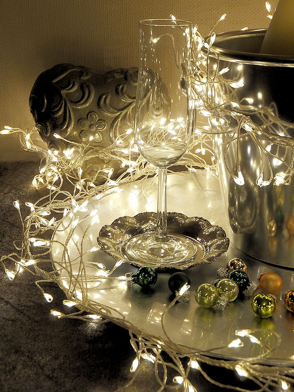Die Tropfen-Büschelkette hat eine Länge von 3 m und besteht aus feinen, gezwirbelten, silbernen Drähten. Da die Kette sich prima in Form bringen lässt und diese auch beibehält, gelingen spielend leicht die schönsten Dekorationen. Von dem gezwirbeltem Metalldraht gehen wiederum feine gedrehte Drahtstege ab, die am Ende eine kleine Schlaufe bilden. Dort sind die ingesamt 480 warmweißen Micro-LED-Tröpchen angebracht. Die Kombination der silbernen Drahtkabel und der herrlich warmweiß strahlenden Lichtpunkte ist besonders edel. In Verbindung mit den 8 wählbaren Lichtfunktionen des integrierten Controllers entstehen wunderschöne Lichtspiele wie Glitzern, Flimmen, Flashing und mehr. Selbstverständlich steht auch ein statisches Dauerleuchten zur Wahl. Ob Sie im Garten Äste umwickeln, im Freien Ihre Balkongeländer verzieren, im Hausgang das Treppengeländer verschönern oder in der Wohnung stilvolle Ensembles auf Sideboards und Tischen arrangieren,Lichtdekorationen mit Draht-Clusterketten zaubern ein märchenhaftes Ambiente. Die Tropfen-Lichterkette verfügt über ein 5 m langes Zuleitungskabel und einen IP44-Außentransformator für den Einsatz im Freien und Innen.