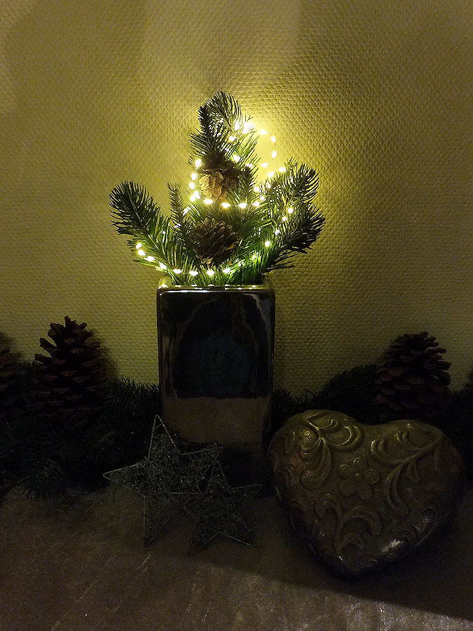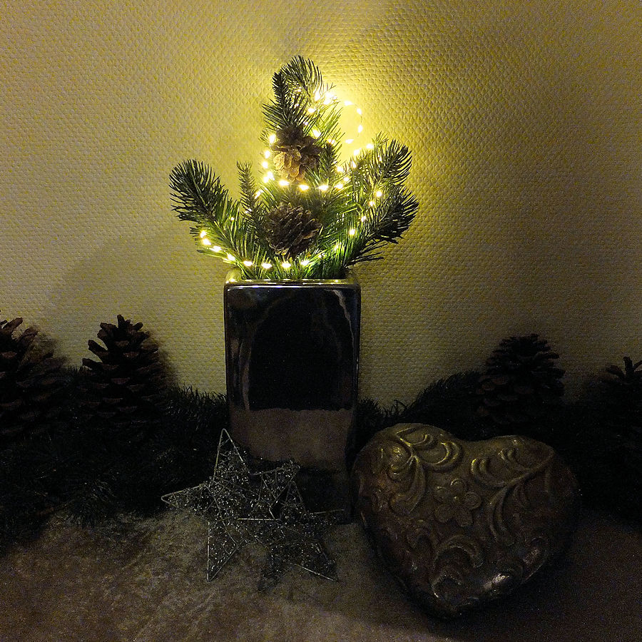 Zauberhafte, batteriebetriebene Draht-Lichterkette in Kurzlänge mit dicht besetzten, kleinen LED-Tropfen für dekorative Highlights im Innenbereich. Die Tropfen-Lichterkette EXTRA BRIGHT mit einer Kurzlänge von 94 cm ist mit 60 warmweißen LED-Tropfen besetzt. Die LED-Tröpfchen mit einem Lampenabstand von nur 1,6 cm reihen sich wie kleine leuchtende Perlchen aneinander. Die Lichtwirkung ist daher besonders eindrucksvoll, hell und erinnert an eine leuchtende Perlenkette. Die LED-Tropfen erstrahlen in einem glanzvoll warmweißen Licht, das in Verbindung mit dem feinen, silbernen Draht der Lichterkette für eine edle Atmosphäre sorgt. Draht-Lichterketten sind wahre Dekokünstler, da sie sich leicht in Form bringen lassen und diese auch beibehalten. Die kurzen LED-Draht-Lichterkette eignen sich für punktuelle Dekorationen und heben besonders Ihre Lieblingsstücke hervor; und wenn Sie mögen, das ganze Jahr über. Die Tropfen-Lichterkette verfügt über ein 30 cm langes, transparentes Zuleitungskabel zum passend transparenten Batteriefach, das zusätzlich mit einem praktischen 6-Stunden-Timer ausgestattet ist. Bei Inbetriebnahme registriert der Timer die Zeit und schaltet nun täglich zur gleichen Zeit die Draht-Lichterkette für 6 Stunden ein und anschließend für 18 Stunden aus. Selbstverständlich können Sie sie auch nach Belieben an- und ausschalten. |