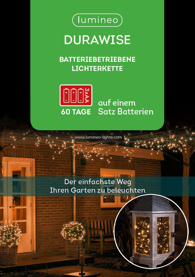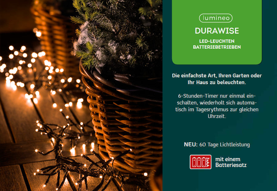 LED-Lichterkette mit klassisch-warm leuchtenden Ricelight-LED, 8facher Lichtfunktion und Batteriebetrieb mit Timer für Außen- und Innendekorationen. Sie suchen eine LED-Lichterkette mit klassisch-warmweißer Lichtfarbe, die Sie netzunabhängig und überall, wo Sie mögen, dekorieren können? Dann ist diese DURAWISE-Lichterkette die richtige Wahl: Die LED-Lichterkette ist mit 192 Ricelight-LED, die als Micro-LED einen Durchmesser von nicht ganz 4 mm besitzen und herrlich kleine Lichtpunkte zaubern, bestückt. Klassisch warme LED erstrahlen in unglaublich schönem, bernstein-farbenem Licht, das der Lichtfarbe von klassischen Glühbirnen nachempfunden ist. Mit einem Lampenabstand der Ricelights von 7,5 cm können Sie einfach, schnell und flexibel Ihre Dekoideen umsetzen. Das praktische und robuste Batteriefach ist zudem mit einem 6Std-Timer ausgestattet, der Ihnen das tägliche An- und Ausschalten der DURAWISE-Lichterkette erspart. Bei Inbetriebnahme der Lichterkette registriert der Timer die Zeit und schaltet sie von nun an im Wechsel für 6 Stunden ein und danach für 18 Stunden wieder aus. Mit einem Batteriesatz beträgt die Leuchtzeit dank des Timers 60 Tage. Die Lichterkette mit Twinklelights kann jedoch noch mehr. Über das Steuergerät mit Memory-Funktion können Sie 8 Lichteffekte auswählen. Vom ganz normalen Dauerleuchten können Sie auch wundervolle Lichteffekte wie beispielsweise Funkeln, Welle, Ebbe und Flut auswählen. Die Batterie-Lichterkette ist mit schwarzem Kabel ausgestattet und hat eine Länge von 14,3 m. Die zusätzliche Zuleitung von der ersten LED bis zum Batteriefach beträgt 50 cm. |