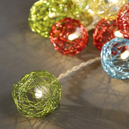 Kugel-Lichterkette mit Batteriebetrieb als modernes und stilbewußtes Licht- und Dekoelement im Innenbereich. Mit der trendigen Batterie-Lichterkette gelingt einfach , praktisch und schnell eine ansprechende Dekoration von Regalen, Sideboards, Tischen, Geländern und Säulen aller Art und alles, was Ihnen lieb und wert ist, gekonnt in Szene zu setzen. Die Lichterkette ist mit 16 prächtigen, farbigen Aluminium-Geflechtkugeln bestückt, die jeweils mit einer warmweißen LED ausgestattet sind. Die Geflechtkugeln mit einem Durchmesser von 4 cm bestehen aus Aluminiumdraht, der kunstvoll zu einer Kugel gebogen ist. Die dezente, harmnische Farbkomposition des Aluminiumdrahtes und das glanzvolle Leuchten der warmweißen LED bieten eine zauberhafte Optik und zeichnen fantasievolle Lichtmuster auf dem Untergrund ab. Die Lichterkette mit transparentem Kabel hat eine Länge von insgesamt 2,55 m einschl. 30 cm zum Batteriefach. Die LED-Aluminiumkugeln haben einen Abstand von 15 cm zueinander. | ![]() |