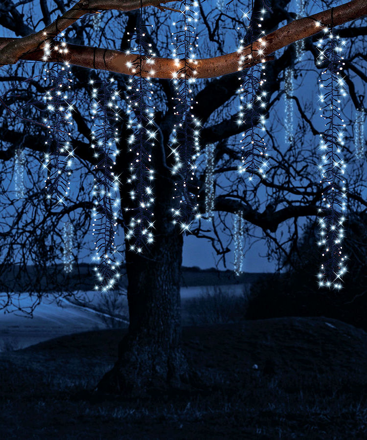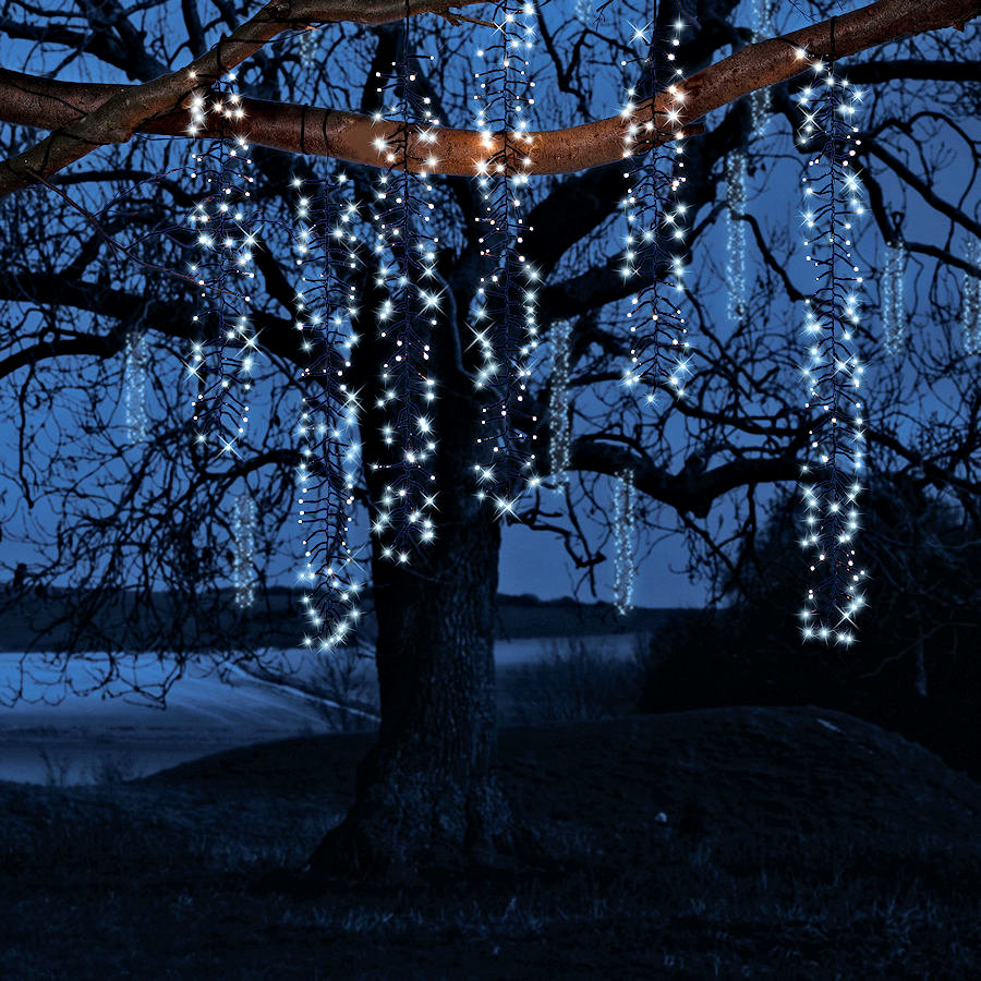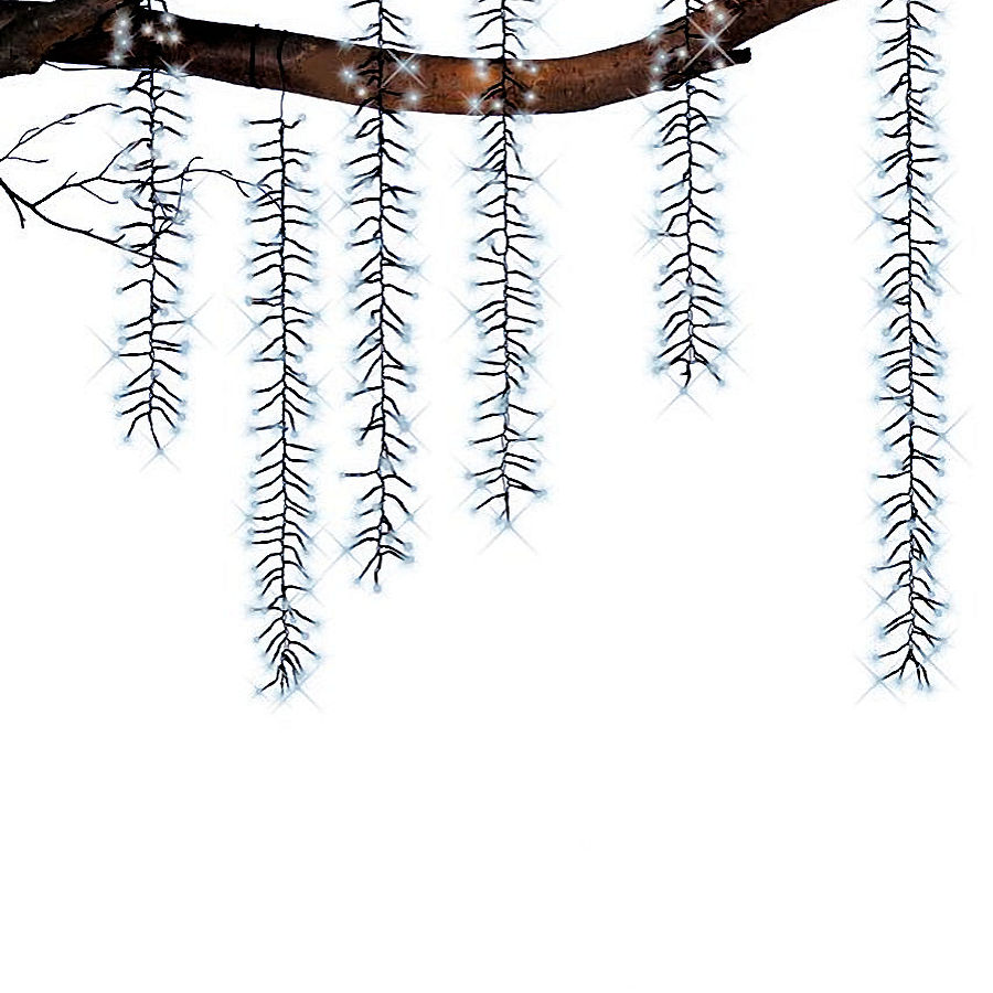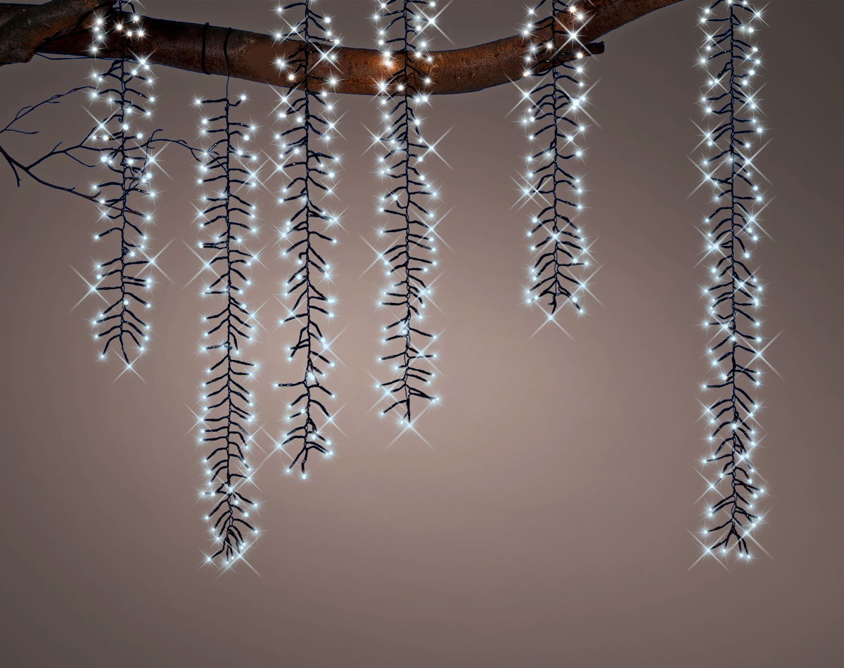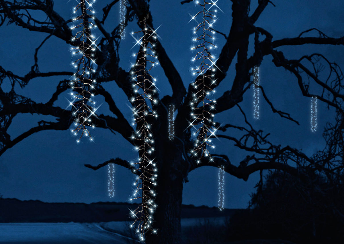 Eine ausgefallene LED-Baumbeleuchtung mit 6 dicht besetzten Strängen als Cluster-Kaskaden mit insgesamt 480 kaltweißen LED. Aufgrund seiner Machart ist diese Lichtdekoration als LED-Baumkaskaden-Beleuchtung einzigartig und ein absolutes Highlight, das besonders die im Winter blattlosen Laubbäume traumhaft in Szene setzt. Der LED-Baumbehang besteht aus einem 10 Meter langen Hauptkabel, von dem 2 Meter lange Stränge nach unten abgehen. Alle 6 Stränge sind am unteren Ende sehr eng mit auffällig leuchtenden LED-Büschel-Ketten, die in hängender Form Kaskaden gleichen, bestückt. Die einzelnen LED-Kaskaden sind dicht mit leuchtenden Dioden in kaltweißer Farbe bestückt. Diese Bestückung erfolgt bei den beiden äußeren Strängen auf einer Länge von 60 cm und bei den mittleren auf einer Länge von 80 cm. Die inneren Stränge sind auf 100 cm Länge bestückt. Damit wird ein sehr dichtes und intensives Leuchtbild erzeugt. In Verbindung mit den 8 wählbaren Lichteffekten des integrierten Controllers inkl. Daurlicht entsteht ein atemberaubendes Lichterlebnis. |
