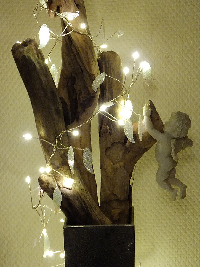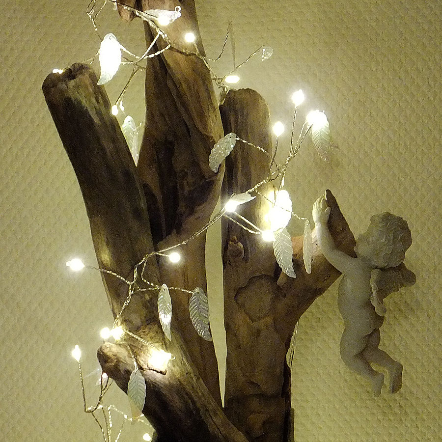 Himmlische LED-Lichterkette für zarte und ideenreiche Dekorationen in Ihrer Wohnung. Die LED-Lichterkette versprüht eine engelsgleiche Note und ist mit zahlreichen irisierenden Glanzblättern bestückt. Mit der Blätter-Clusterkette gelingen fantasievolle und flexible Lichdekorationen, die Ihrem Ambiente ein himmlisches Flair verleihen. Die dezent farbig irisierenden und leicht transparenten Blätter zwirbeln sich, aufgefädelt auf feinen Silberdrähten, um eine Lichterkette aus silbernem Draht. Diese Kette ist mit 80 warmweißen Tropfen-LED bestückt, die im Schlaufenden der Silberdraht-Stege sitzen und sich mit den feinen Blättern abwechseln. Von Vorteil ist, dass sich die Silberdraht-Kette biegen lässt und so ihre Form beibehält. Dank des Batteriebetriebes kann die Blätter-Lichterkette einfach und schnell die herrlichsten Dekorationen verwirklichen. Praktisch und komfortabel ist, dass das Batteriefach über eine praktische Timerfunktion verfügt. Bei Inbetriebnahme registriert der Timer die Zeit und schaltet von nun an im Wechsel die Lichterkette für 6 Stunden ein und danach für 18 Stunden aus. Wenn Sie mögen, können Sie die Perlen-Lichterkette auch nach Bedarf an- und ausschalten. Das Kabel zwischen dem Batteriefach und der dekorierten Kette hat eine maximale Länge von 30 cm. Ohne diese Zuleitung beträgt die Länge der LED-Dekolichterkette 1,8 m. |