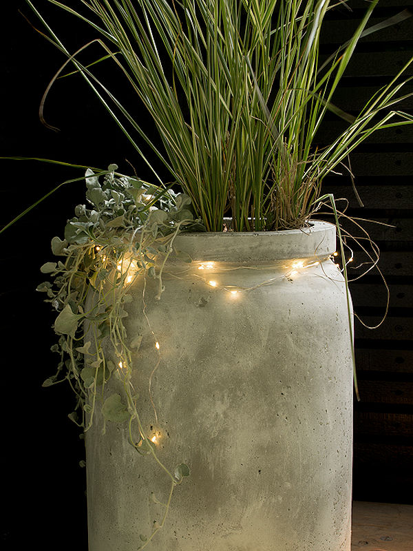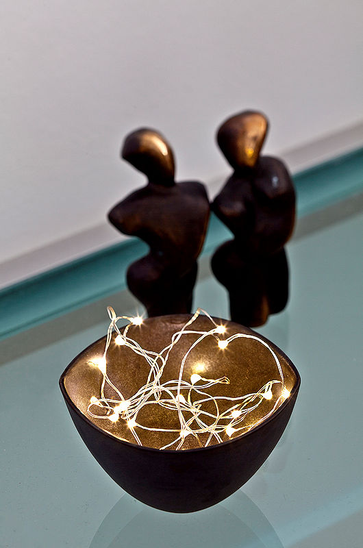 Hinreißende Lichterkette mit kleinen LED-Tröpfchen und Batteriebox mit Timerfunktion für den Innenbereich. Die Kette ist ca 4,2 Meter lang und mit 40 warmweißen LED in Tropfenform bestückt. Die kleinen LED-Tropfen erinnern an Tautropfen, die im Licht wundervoll warmweiß glitzern. Sie sind nicht mit einem Kabel verbunden, sondern mit silberfarbenem Metalldraht, der sich biegen lässt und seine Form beibehält. So lassen sich zauberhafte Dekorationen in Wohnräumen gestalten. Die Tropfen sind im Abstand von ca. 9,5 cm angeordnet, wobei der Abstand zwischen dem letzten Tropfen und dem Batteriefach ca. 30 cm beträgt. Die schicke Batteriebox verfügt über einen integrierten Timer mit 2, 4, 6 oder 8 Stunden-Automatik. Die Timer-Nutzung fördert die Langlebigkeit der Batterien, ohne dass diese über die Weihnachtszeit gewechselt werden müssen. Die Lichterkette kann jedoch selbstverständlich auch zwischen den Intervallen nach Belieben an- und ausgeschaltet werden. Zur Steuerung des integrierten Timers wird die optional erhältliche Fernbedienung benötigt. |
