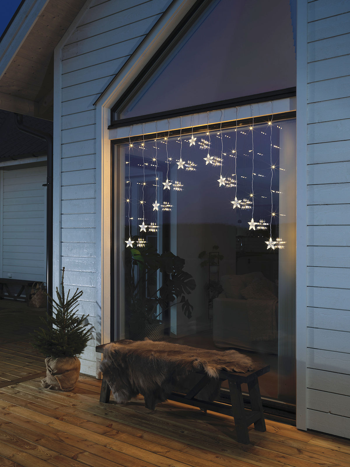 Der LED-Sternen-Vorhang ist ein außergewöhnlicher Blickfang in der besinnlichen Advents- und Weihnachtszeit. Der LED-Lichtervorhang besteht insgesamt aus 11 Strängen, von denen die äußeren mit jeweils 5, 4, 3 und 2 warmweissen LED bestückt sind. Am Ende jedes Strangs befindet sich ein Stern mit 5 LED. Die Stränge sind auf einer Breite von 120 cm von Außen nach Innen in unterschiedlichen Längen von 120 cm, 100 cm, 80 cm, 60 cm, 40 cm und schliesslich 20 cm gehalten. Dadurch ergibt sich ein nach Außen öffnendes Dreieck. Mit seinen tollen Abmessungen passt er in fast jedes Fenster. |
